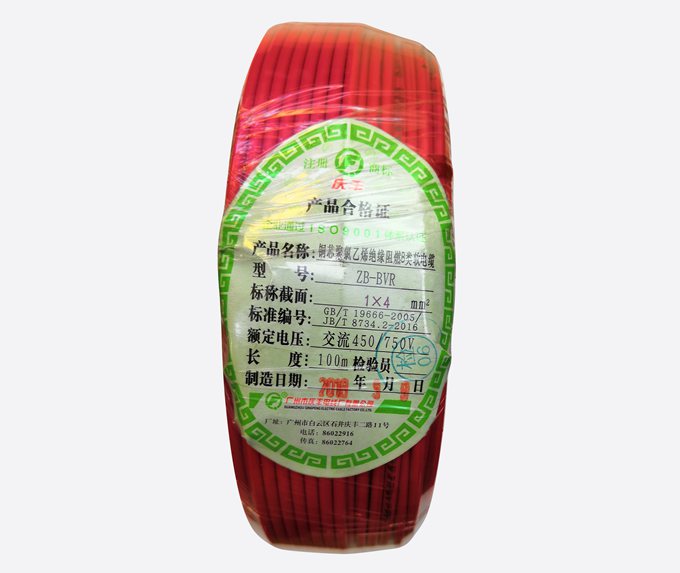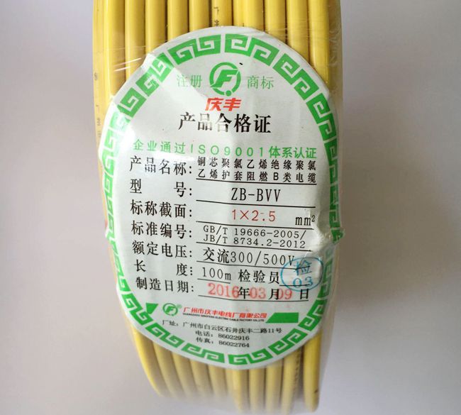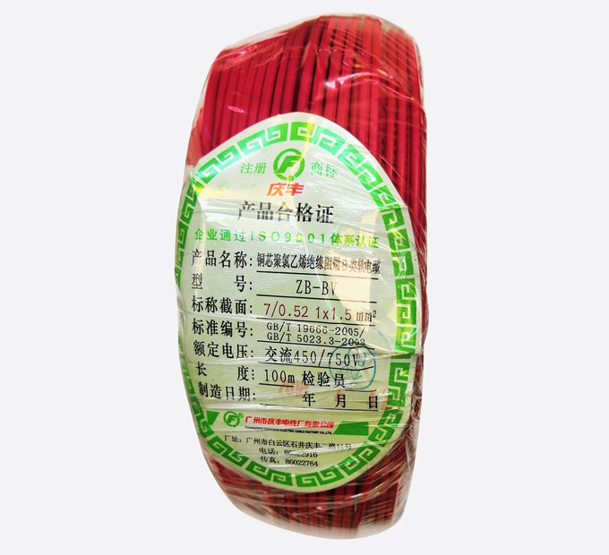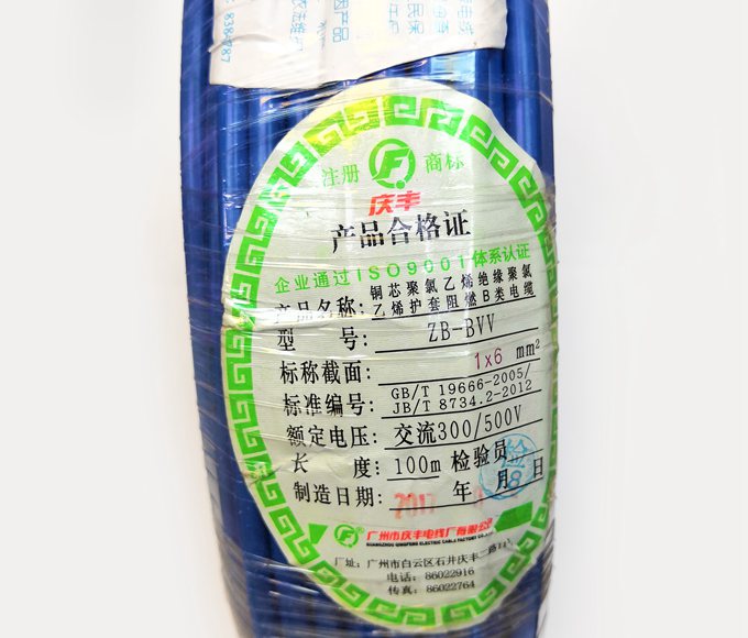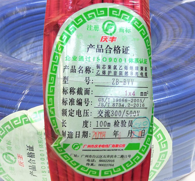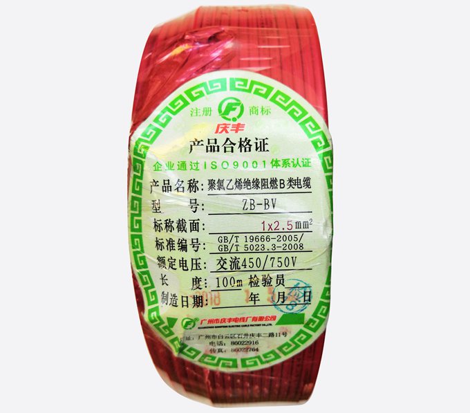 广州庆丰电缆ZB-BVV阻燃B级家装电线